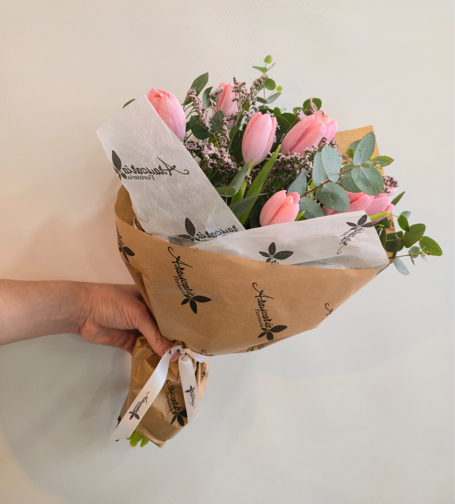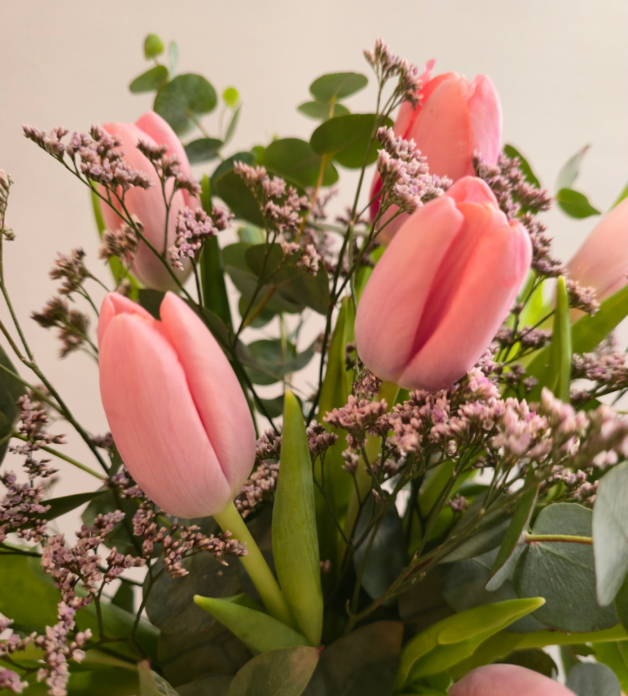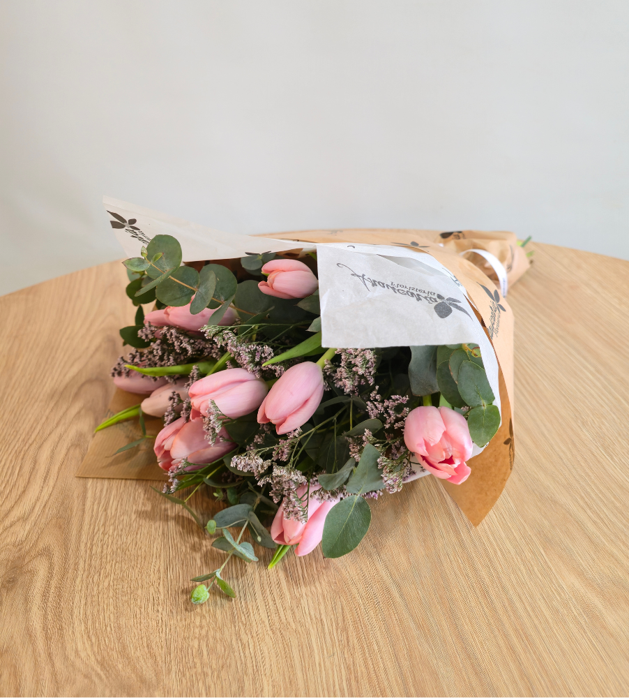 Ramo de 10x tulipanes rosas, limonium y verdes variados.