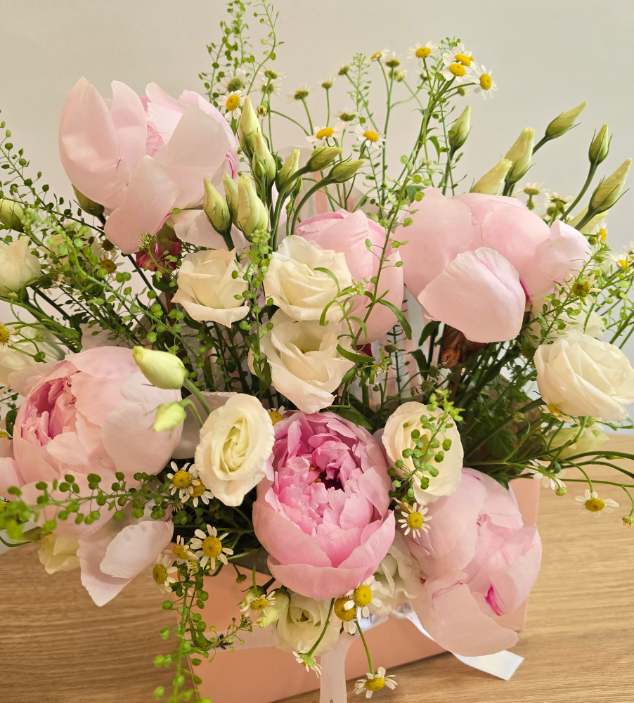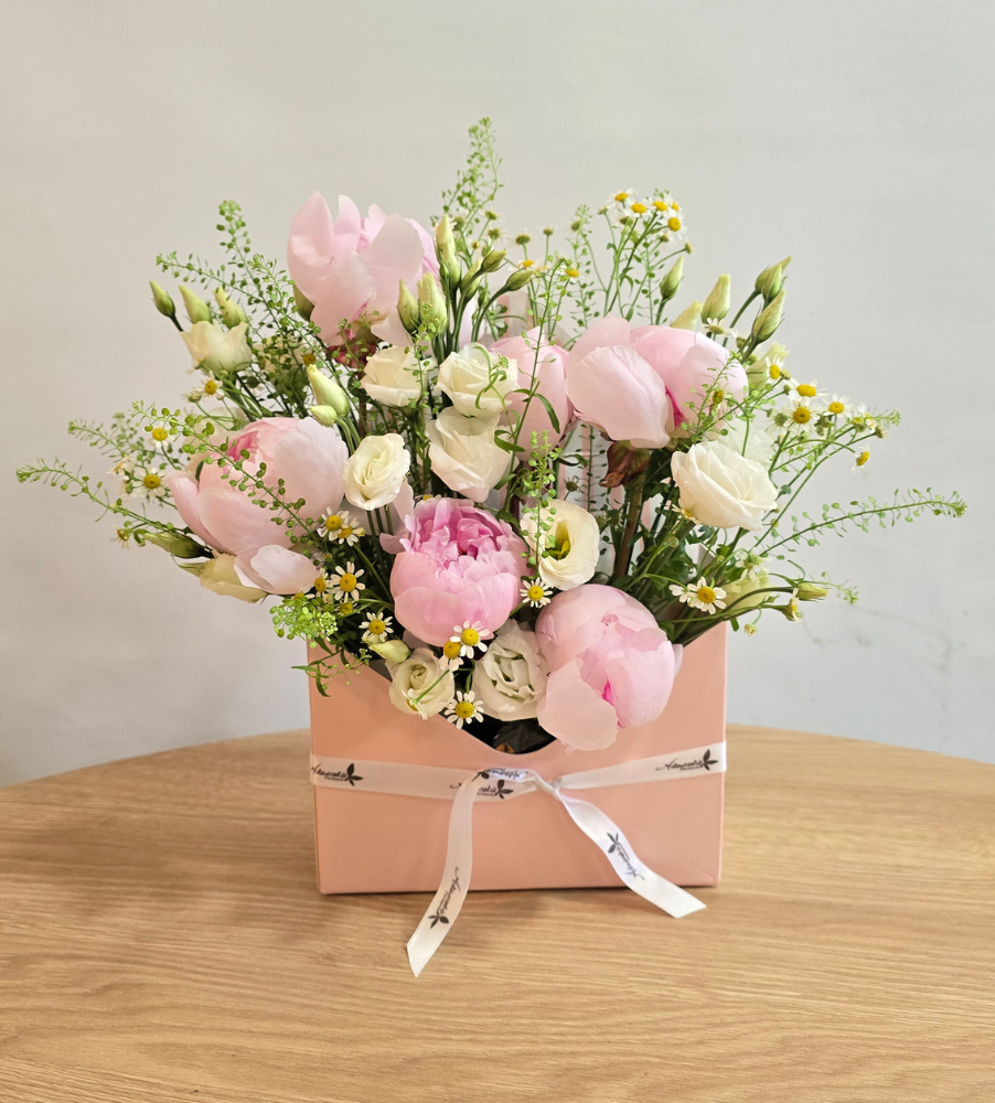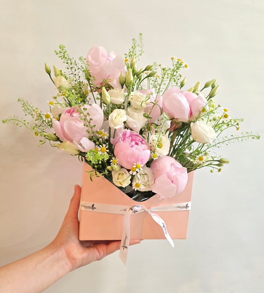 Delicada composición floral con peonias presentada en una original cajita con forma de sobre, ideal para sorprender en cualquier ocasión.