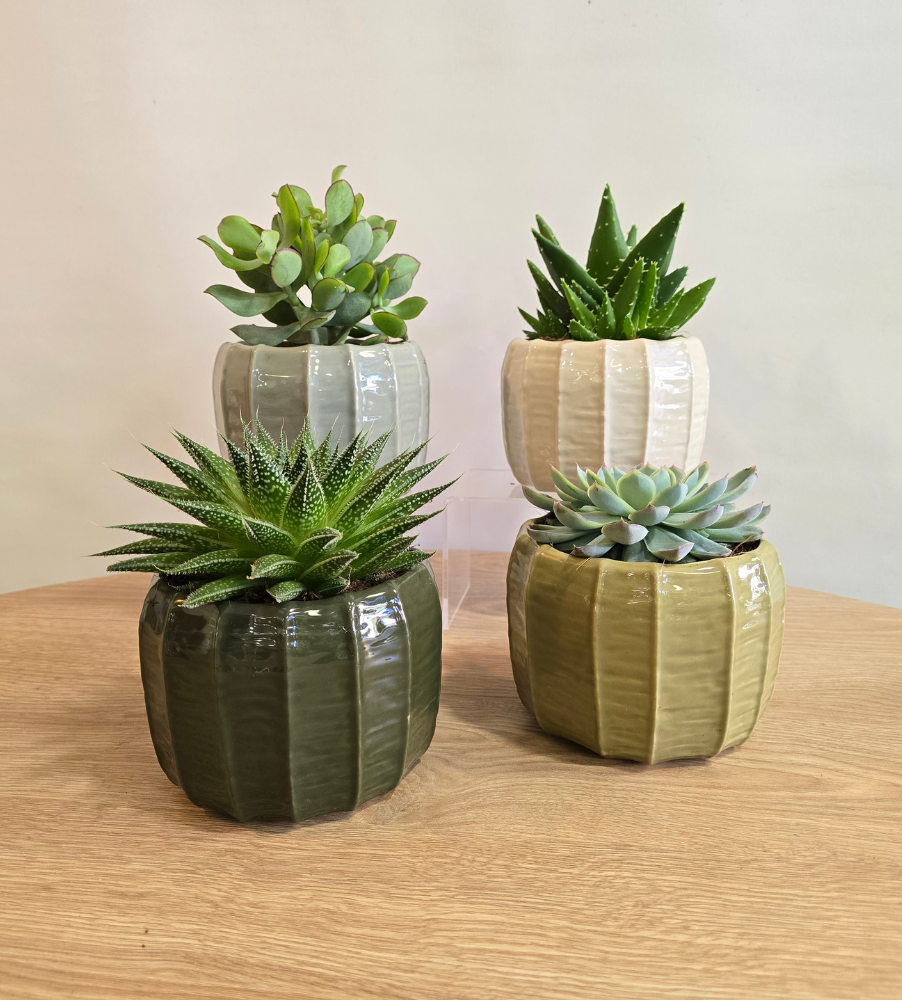 Selección de suculentas naturales presentadas en maceta decorativa, elegidas de forma aleatoria entre distintas variedades disponibles. Cada unidad es única, lo que las convierte en un detalle ideal para regalar o enviar directamente a domicilio.